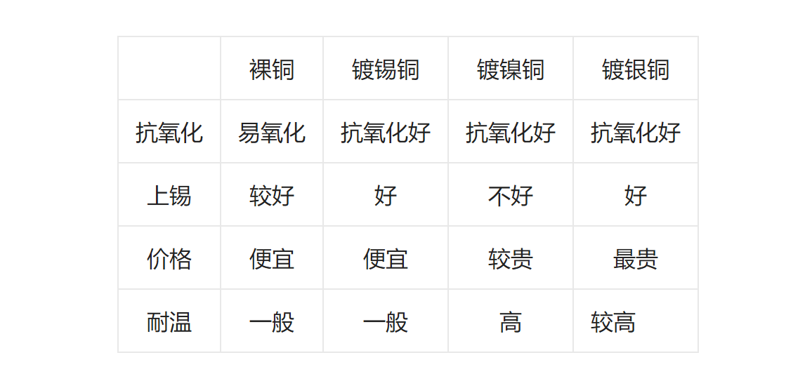 在裸銅,鍍錫銅,鍍鎳銅中價錢最高,抗氧化好,好上錫,雖耐高溫性能不如鍍鎳銅,但導體使用性能最好(特別是高頻)。